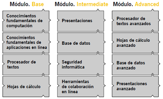 Conocimientos fundamentales de computación. “Este módulo enseña los conceptos y habilidades esenciales relacionados con el uso de dispositivos, creación y administración de archivos, redes y seguridad de la información” (ICDL, 2016c, párr. 3).