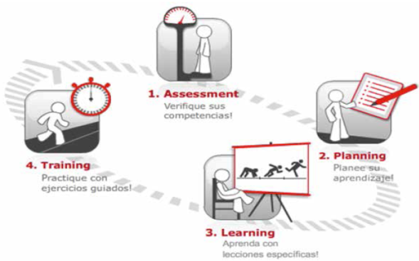 Planning. Esta etapa permite examinar los resultados de las pruebas de nivel y sugiere un curso de aprendizaje centrado en sus necesidades específicas. En una representación gráfica se muestra el resumen del nivel de competencias, y se señalan las lecciones y los ejercicios que deben realizar los profesores para continuar con su aprendizaje personalizado.