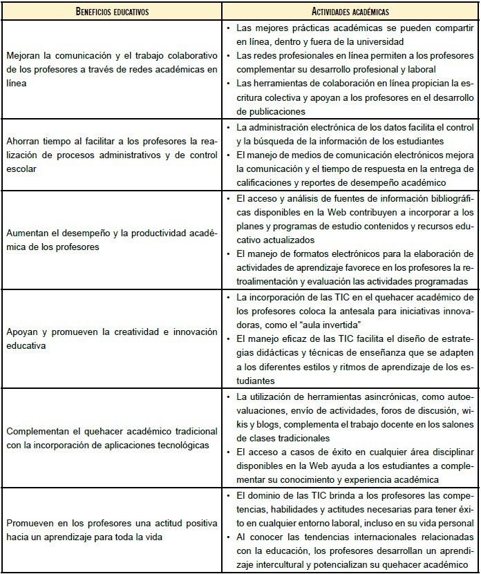 En la Tabla 1 presentamos los beneficios educativos que pueden aportar los profesores que cuentan con certificaciones en competencias digitales.