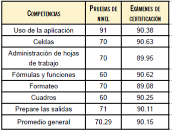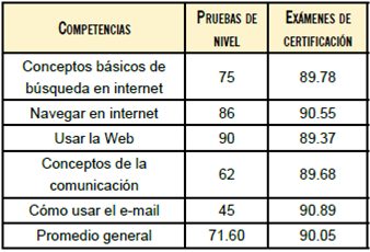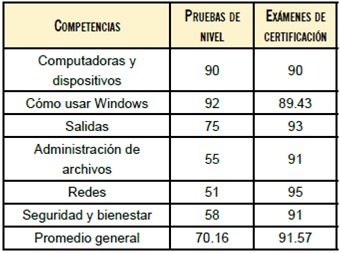 La Tabla 2 contiene el desglose de las medias aritméticas de cada una de las competencias correspondientes al módulo de conocimientos fundamentales de computación, así como los promedios generales de las pruebas de nivel y los exámenes de certificación de los 76 profesores.