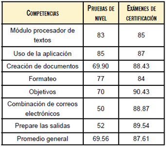 La Tabla 4 presenta el desglose de las medias aritméticas de cada una de las competencias del módulo de procesador de textos, así como los promedios generales de las pruebas de nivel y los exámenes de certificación de los 76 profesores.