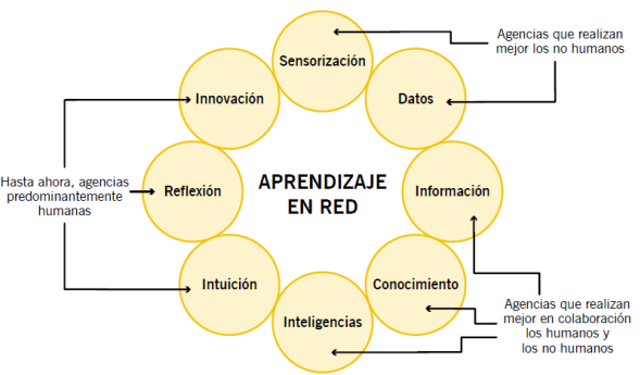 A continuación, presentamos una propuesta de agencias generales que conformarían el aprendizaje en red y que han sido adaptadas del procedimiento general de las redes ciberfísicas propias de la cuarta revolución industrial (Hermann et al., 2016) (ver figura). En el nivel descriptivo, es necesario identificar qué elementos humanos y no humanos se asocian para generar cada una de estas agencias. Como explicamos en la figura, algunas de estas agencias las realizan mejor los elementos no humanos, otras los humanos, y otras se efectúan mejor en colaboración de ambos. Las agencias operan en la red sin orden preestablecido, de manera continua, y serán efectivas siempre y cuando sean performativas, es decir, siempre que mantengan bien asociados a varios elementos de la red.