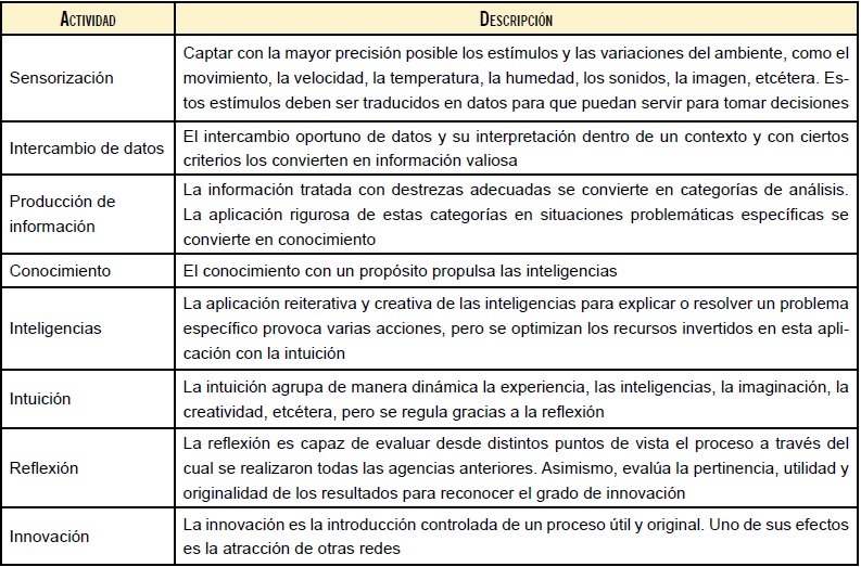 En el nivel conceptual, es necesario explicar con una categoría de análisis cuáles problemas impiden que los elementos humanos y no humanos se asocien para generar y sostener cada una de estas agencias al tiempo que se registra cómo logran los elementos de la red superar ese problema. Por eso, es conveniente una descripción general de las agencias que constituyen las redes ciberfísicas en la cuarta revolución industrial (ver Tabla).