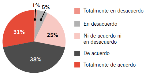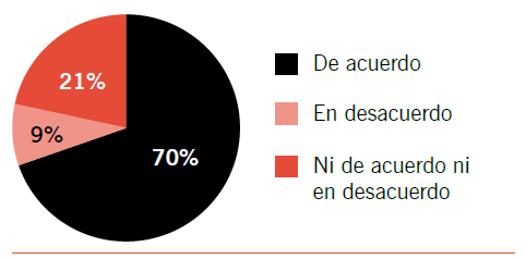 Al preguntar si el uso de las redes sociales podría apoyar su aprendizaje en inglés, de acuerdo con la gráfica 4, las respuestas se tornaron contundentes: 70% está de acuerdo en que utilizar estas herramientas puede ayudarles a mejorar su aprendizaje, mientras que 21%, no está de acuerdo ni en desacuerdo, y solo g% señala que no.