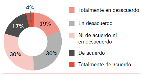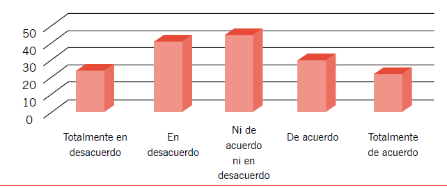 En el caso del uso de plataformas, específicamente el Moodle, 19% de los encuestados señala estar totalmente en desacuerdo y 30% está en desacuerdo respecto a que estas plataformas pueden ayudar en su aprendizaje, lo que significa que casi 50% considera que no son de utilidad; 30% no está de acuerdo ni en desacuerdo; solo 17% percibe que la tecnología apoya su aprendizaje del inglés, pues está de acuerdo y 4% está totalmente de acuerdo (ver gráfica 9).