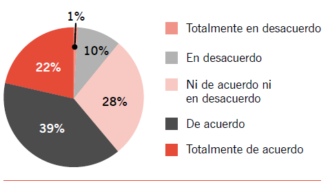 De igual forma, entre los resultados destaca que 22% de los encuestados está totalmente de acuerdo y 39% dice estar de acuerdo en que utilizar los recursos tecnológicos ofrecidos por su profesor para reforzar el idioma inglés les ayuda en su aprendizaje; solo 10% no está de acuerdo y 1%, totalmente en desacuerdo; el resto, que corresponde a 28% no presenta una opinión definida sobre el tema (ver gráfica 3).