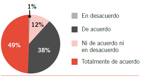 En relación con la percepción de los estudiantes sobre si consideran que utilizar las TIC les facilita la comprensión del idioma, según se muestra en la gráfica 7, 49% de los encuestados indica estar totalmente de acuerdo y 38%, de acuerdo; 12% no manifiesta una postura clara, pues señaló no estar ni de acuerdo ni en desacuerdo y 1% está en desacuerdo.