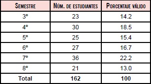 El estudio se aplicó a la totalidad de la población que cursa esta carrera, tanto en el turno matutino como el vespertino, y que representa 320 matriculados; sin embargo, al momento de la validación del instrumento, únicamente consideramos aquellos que habían contestado el 100% de las preguntas, que fueron en total 162 encuestados; de estos, 88 son mujeres y 74, hombres. En cuanto al semestre, el número de encuestados se distribuyó de la manera en que se presenta en la tabla.