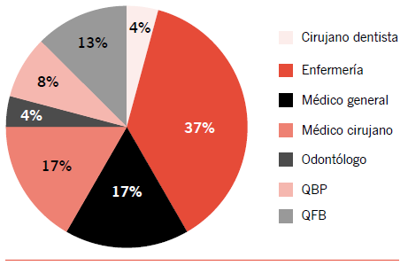 La información obtenida, de acuerdo con los datos personales, señala que los participantes cursaron una licenciatura relacionada con las ciencias biológicas y de salud. En la gráfica 1 observamos que 37% corresponde al perfil de enfermería y 17% a médico general y otro 17% a médico cirujano.