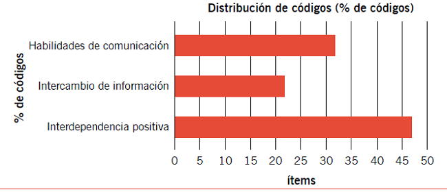 En relación con el análisis cualitativo (ver gráfica 2), se puso en evidencia la dimensión de la interdependencia positiva. Desde el enfoque psicológico, Johnson y Johnson (1997) señalan que la interdependencia positiva es el primero y más importante de los elementos del aprendizaje colaborativo. Requiere el establecimiento de una tarea clara y una meta de grupo para que los estudiantes estén convencidos de que, si uno falla, todos fallan.