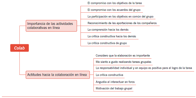 El instrumento aplicado deriva de la línea de investigación relativa a la colaboración en AVA; fue elaborado por Soto y Torres (2016) y se ha aplicado en otros trabajos con el mismo tema. El instrumento suministrado es un cuestionario denominado Colab, el cual se integró de cuatro ítems de identificación personal y 16 ítems agrupados en dos dimensiones (percepción y actitud) para analizar las valoraciones del trabajo colaborativo por parte de los participantes. Utilizamos una escala Likert de cuatro valores: determinante, significativo, poco y nulo, construido acorde con las dimensiones e indicadores (ver figura).