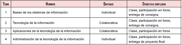 El objetivo final de la asignatura es proporcionar los conocimientos respecto a los sistemas y tecnologías de la información agrupados en cuatro grandes temas que se distribuyen en seis clases: a) bases de los sistemas de información, b) tecnología de la información, c) aplicaciones de la tecnología de la información, y d) administración de la tecnología de la información. En cada tema se incluyeron los objetivos, los materiales de consulta, la guía de puntaje, foro para la resolución de dudas y foros de debate, así como el espacio para subir las consignas para la evaluación de cada tema.