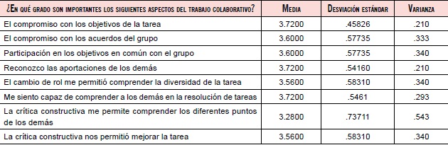 En cuanto a los resultados del instrumento Colab sobre la dimensión de la importancia de las actividades basadas en el trabajo colaborativo, las medias obtenidas señalan que la realización de las consignas e intervención en los foros fueron aceptables; la media más alta, 3.7200 (ver tabla 2) fue para los indicadores del compromiso con los objetivos de la tarea, el reconocimiento de las aportaciones de los demás y la capacidad de compresión en la resolución de las tareas.