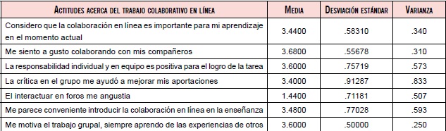 En cuanto a las actitudes acerca del trabajo colaborativo en línea conforme a las medias obtenidas (ver tabla 3), la media alta de 3.6800 destaca que los participantes se sienten cómodos al colaborar con sus compañeros. Un participante expone sus apreciaciones acerca del trabajo colaborativo realizado en esta asignatura (A9):