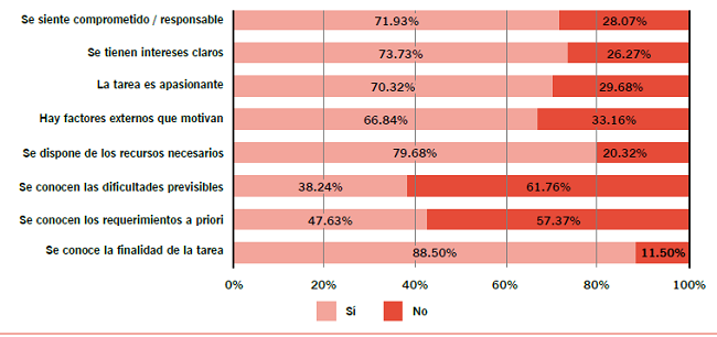 Para incrementar la motivación del desempeño del alumno, encontramos que es importante dar a conocer la finalidad de la tarea (88.50%) y tener los recursos para su desarrollo (79.68%). Un dato interesante es que el conocer la dificultad de la tarea es irrelevante (38.24%), como se aprecia en la gráfica 1.