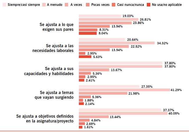 Encontramos que cuando los alumnos acceden a internet para aprender, lo hacen principalmente con base en los objetivos que se definen en la asignatura o proyecto en el que trabajan (77.3%). También observamos que el elemento que no se considera relevante es la exigencia de colegas y pares (30.29%) (ver gráfica 2).