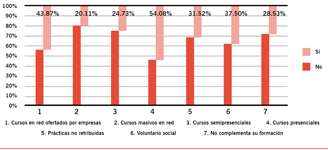 La mayoría de los alumnos prefieren cursos presenciales (54.08%) y en red ofrecidos por empresas, mientras que los cursos masivos en red (MOOC, por sus siglas en inglés) no son considerados como opciones para complementar la información (20.11%).