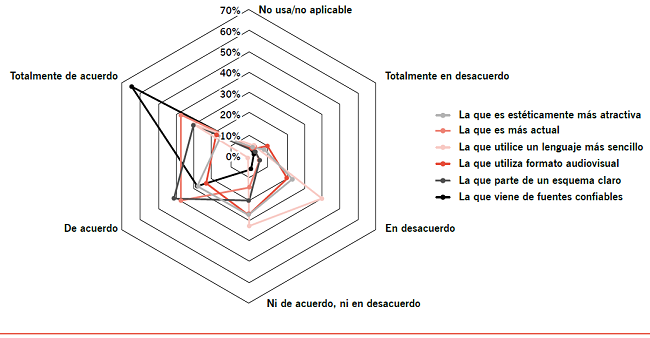 Los alumnos seleccionan su información principalmente si proviene de fuentes confiables (90%) y si está actualizada (77.2%); sin embargo, el hecho de que la información sea atractiva o esté en formatos alternos a los convencionales es irrelevante (gráfica 4).