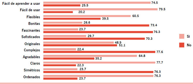 Para complementar el análisis, añadimos dos preguntas del cuestionario estructurado por Córdoba (2013) que tienen que ver con la experiencia del usuario extendida (UxE), el cual obtuvo un alfa de Cronbach de .893. Estos ítems miden los constructos de prospección de utilidad, usabilidad y satisfacción de las tecnologías digitales que usan los alumnos en su formación académica. Las preguntas plantean conocer cuáles son los sentimientos que provoca el uso de herramientas digitales y las razones de elección del alumno.
