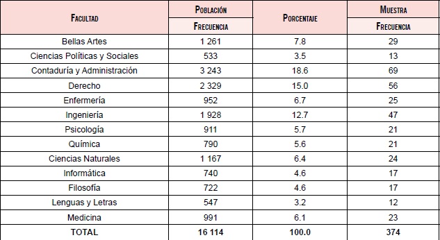 Seleccionamos una muestra representativa con un error de ≥5% y una confiabilidad ≤95%, pues permite reducir la varianza y la desviación estándar del tamaño de la muestra (Kish, 2005). El muestreo se realizó por estratos representados por las 13 facultades de la universidad que se encuentran en el área metropolitana. La técnica fue probabilística por racimos y formamos grupos de cada facultad al azar (ver tabla 1).