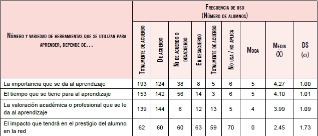 Las razones por las que los alumnos deciden usar diversas herramientas tecnológicas depende, en mayor medida, de la relevancia que estas puedan tener en el aprendizaje ( = 4.27 y σ = 1.00), mientras que el impacto en la red no es importante ( = 2.45 y σ = 1.73).