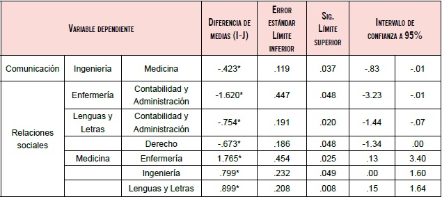 Al tener en cuenta las características de la muestra y con base en los resultados obtenidos del estadístico de Levene (p-valor >.05), efectuamos una prueba paramétrica ANOVA de un factor con corrección de Welch y pruebas post-hoc para identificar si existen diferencias entre facultades respecto a los usos de internet y encontramos diferencias entre diversas facultades (ver tabla 3).