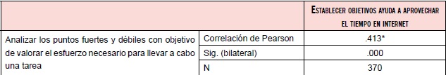 Los alumnos están de acuerdo en que establecer objetivos ayuda a aprovechar el tiempo que destinan a internet ( = 3.96 y σ = 1.02), al mismo tiempo que suelen analizar sus puntos fuertes y débiles cuando están en línea. Existe una alta correlación entre la autovaloración que se da el alumno a sí mismo y determinar objetivos para la elaboración de la tarea (ver tabla 4).