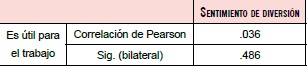 Después de efectuar la correlación que existe entre los sentimientos que presentan los alumnos al usar una herramienta o aplicación para el aprendizaje, encontramos que existe una correlación entre todas las variables que se refieren al sentimiento de eficiencia, experiencia positiva, disfrute por aprender, satisfacción, placer y beneficios para el aprendizaje. Sin embargo, no existe una correlación entre el sentimiento de diversión y la sensación de que es útil para el aprendizaje (ver tabla 5), lo cual permite entender que estas dos variables son independientes.