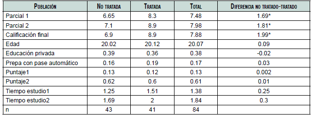 La población de estudio se refiere a estudiantes de la LRI en modalidad presencial que cursaron la materia de Microeconomía durante el otoño 2017. Esta población se describe en la tabla 2, en la cual observamos que se compone de 84 estudiantes, divididos en dos grupos: uno llamado tratado, que se refiere a 41 estudiantes que en un tema se les proporcionó videos como material didáctico, y otro denominado no tratado, conformado por 43 alumnos que no recibieron los videos, a partir de las variables observables.