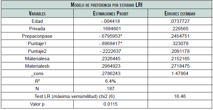 donde Pr(Y=1│Xi ) es la probabilidad de estudiar la LRI; Xmateriala es la preferencia del alumno por materiales didácticos tradicionales, como libros, revistas, artículos científicos; Xmaterialb es la preferencia del alumno por materiales didácticos basados en TIC; μ es la variable no observable; las demás variables ya fueron explicadas.