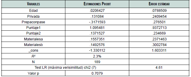 En la tabla 4 (siguiente página) incluimos la estimación de un modelo de probabilidad para determinar la aleatoriedad del tratamiento. Esto se hizo incluyendo en la estimación a alumnos que no pertenecen a la LRI, pero que sí forman parte de la facultad a la que esta pertenece. El modelo (6) presenta la ecuación estimada cuya variable dependiente es la participación en el tratamiento y las variables independientes son las mismas mostradas antes:
