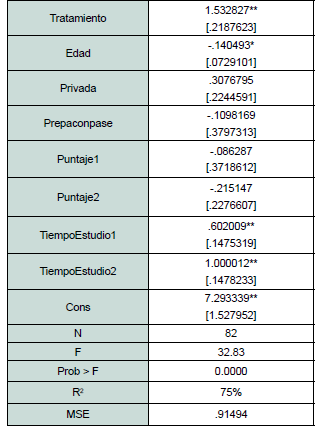 donde la variable Finali es la calificación obtenida en el curso; toma valores de 0 a 10; p es la participación en el tratamiento; toma valores de 1 si participó y 0 si no participó; Xedad es la edad del estudiante; Xprivada es el tipo de estudios a nivel preparatoria; toma valor de 1 si estudiaron en escuela privada y 0 si estudiaron en preparatoria pública; Xprepaconpase toma valor de 1 si estudiaron la preparatoria en una unidad académica de la universidad y 0 en cualquier otro caso; Xpuntaj1i es el puntaje obtenido en el examen de admisión, su rango es de 550 a 650 puntos; Xpuntaj2i es el puntaje obtenido cuyo rango es de 650 a 750 puntos; XTiempoEstudio1 son las horas de estudio por semana para el primer parcial; XTiempoEstudio2 horas de estudio por semana para el segundo parcial.