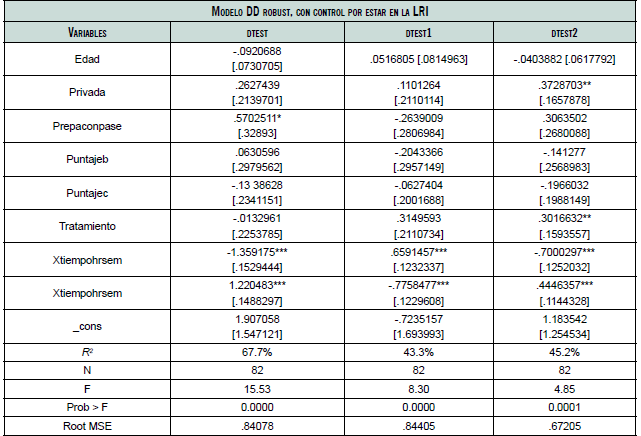 Las estimaciones para el modelo DD se presentan en la tabla 6, en la cual advertimos que, en la columna dtest las horas dedicadas al estudio y preparatoria con pase son estadísticamente significativas; sin embargo, conforme realizamos las pruebas para dtest1 y dtest2, observamos que la variable de preparatoria con pase directo deja de ser significativa; en cambio, la variable estudios privados toma significancia al 5%, lo que sugiere que afectan de modo directo el rendimiento académico de los estudiantes. De igual modo, notamos que el tratamiento es estadísticamente significativo solo cuando se compara el primer examen con el examen final y se alcanza un impacto de .30 puntos de calificación, lo que equivale a un incremento del 3.54% en la calificación.