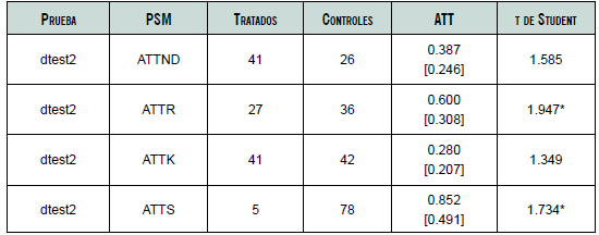 Es importante señalar que las estimaciones del ATT se hicieron considerando un soporte común para el tratamiento y los controles; asimismo, utilizamos muestreo con reemplazo; además, los errores estándar se obtuvieron con bootstrap con mil repeticiones.