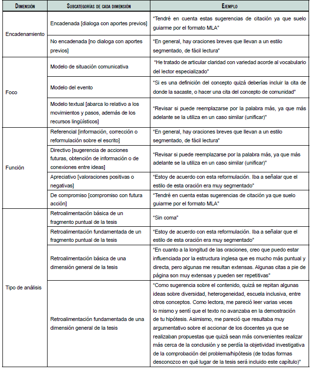 Para el propósito de este trabajo, en cada comentario -nuestra unidad de análisis-, analizamos tanto las R en el texto como las R globales que cada estudiante ha efectuado en relación con el capítulo del par y con el propio. El análisis cualitativo de estas intervenciones ha comprendido diferentes dimensiones, que son incluidas en la tabla 1, así como las subcategorías asociadas a estas y un ejemplo de cada una (ex profeso se repiten algunos ejemplos para mostrar cómo se asignan las categorías).