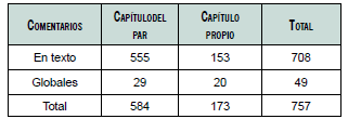 Cabe señalar que los comentarios en texto evidencian una gran dispersión, tanto respecto del capítulo de tesis de su par (rango entre 28 y 331; DS = 95,7) como de su propio capítulo (rango entre 2 y 128; DS = 41,23).