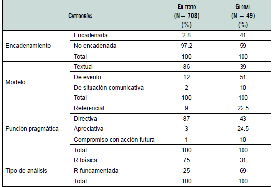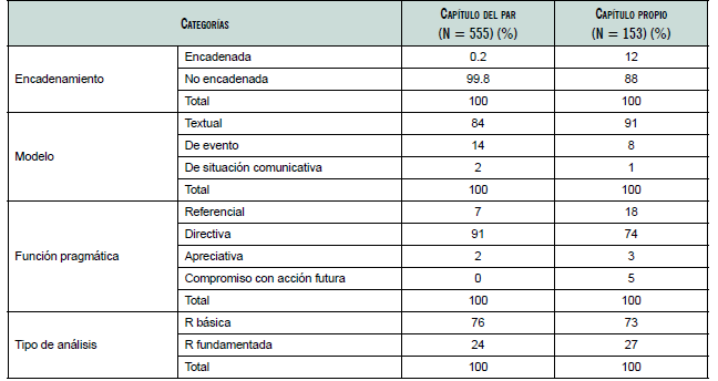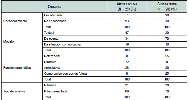 A fin de respetar la consistencia de los resultados, una de las autoras realizó el análisis completo, mientras que la segunda lo revisó como un tipo validación interjuez; por último, ambas conversaron en torno a los casos en que diferían hasta alcanzar consenso. Tras finalizar este proceso, cuantificamos las R en texto y globales al capítulo del par y al propio, según encadenamiento, foco, función y tipo de análisis. El corpus quedó conformado como se presenta en la tabla 2.