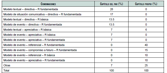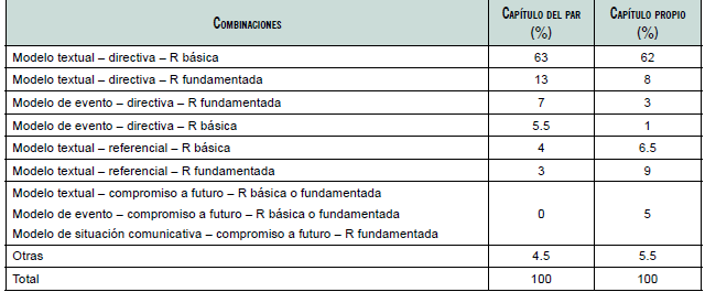 Otras combinaciones refieren al modelo de evento - directiva - R básica; modelo de situación comunicativa - apreciativa - R fundamentada; modelo textual - referencial (apreciativa o compromiso a futuro) - R básica; modelo de situación comunicativa - apreciativa o compromiso con acción futura - R básica o fundamentada.