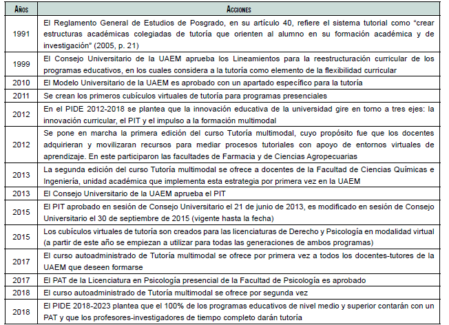En la UAEM, la tutoría se consideró desde los años noventa. En la tabla 1 presentamos su evolución institucional.