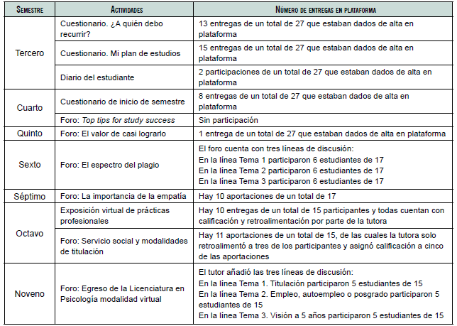 En cuanto a la tutoría en los cubículos virtuales, se registraron once actividades del tercero al noveno semestres, que se presentan en la tabla 2.