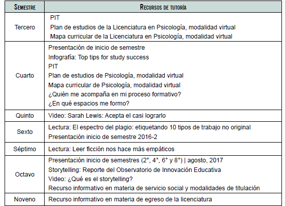 En la tabla 3 (siguiente página) se registran estos recursos, de los cuales hay una variedad de formatos (video, presentaciones, textos, infografía) que guardan relación con el tipo de actividades de la tutoría programadas. En algunos cubículos se cuenta con la presentación de inicio de semestre con los pormenores de la operación, por ejemplo, calendario de bloques, fechas de exámenes, evaluación, etcétera, que le ayudan al estudiante a recordar los momentos importantes de la operación de cada bloque.