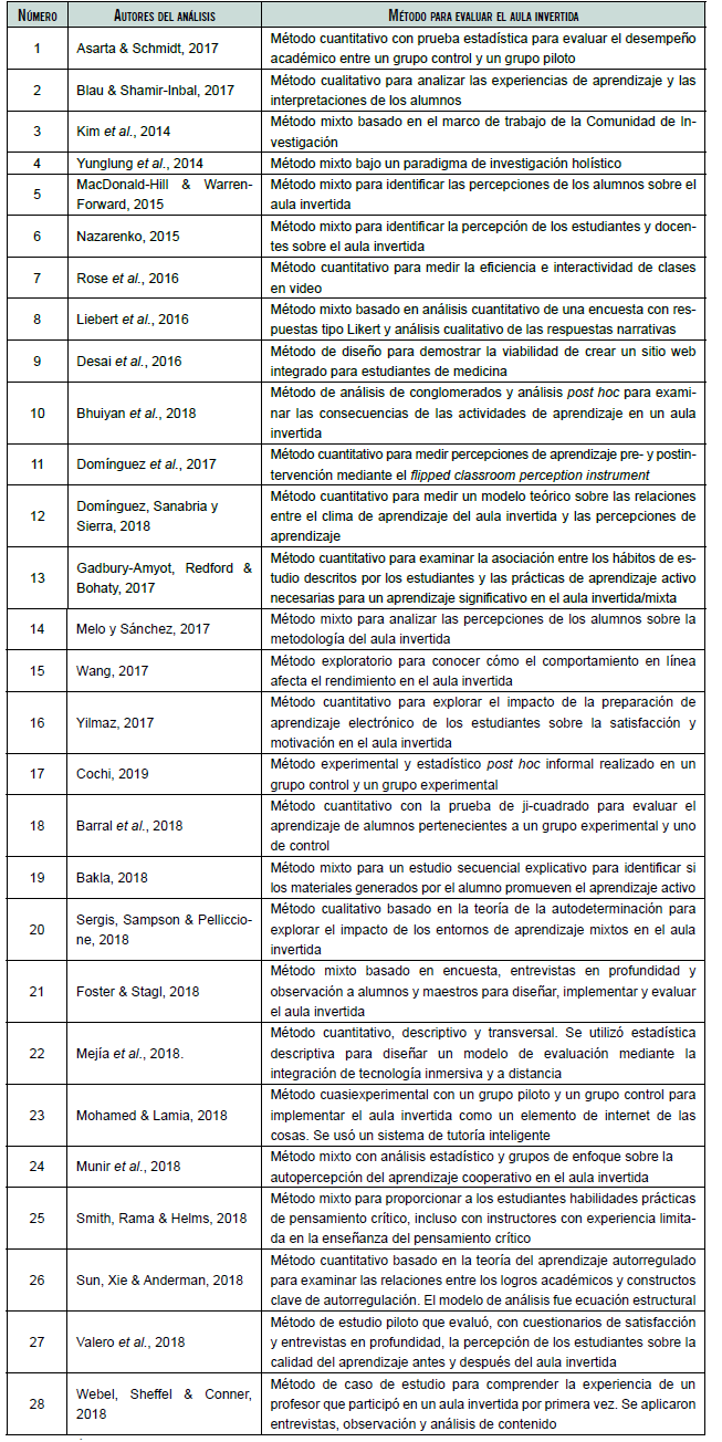 En principio, la literatura examinada muestra que, además del análisis de aprendizajes, el aula invertida ha sido abordada con otros métodos. La tabla 1 contiene los autores que lo han utilizado.