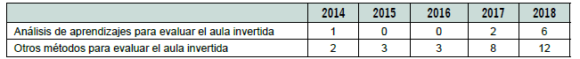 Los resultados obtenidos al analizar el mismo tema por año sugieren que el interés por aplicar el análisis de aprendizajes para evaluar el aula invertida está creciendo. En 2014 se publicó un artículo al respecto, pero en 2015 y 2016 no hubo; en 2017 se publicaron dos artículos y en 2018 el número se elevó a seis (ver tabla 3).