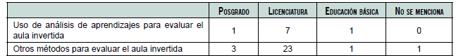 Para identificar en qué nivel educativo se ha utilizado este análisis, hicimos un conteo simple y los resultados se muestran en la tabla 4 (página siguiente). Es importante mencionar que ningún texto informa sobre la aplicación de este análisis en el nivel de educación media superior. El nivel educativo más abordado es la educación superior, con siete artículos. Solo uno hace mención de la aplicación del análisis en posgrado y uno más, en educación básica. Es relevante que también en este caso se hayan utilizado mucho más otros métodos para evaluar el aula invertida (esos métodos han sido descritos en detalle en la tabla 2). En la educación superior se ha evaluado más el aula invertida con otros métodos que no son análisis de aprendizajes.