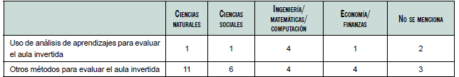 El área de conocimiento en la cual se ha aplicado más el análisis de aprendizajes en el aula invertida es ingeniería/matemáticas/computación, cuatro artículos mencionan este proceso de análisis. Las demás áreas han sido poco abordadas. Es evidente el uso de otros métodos que no son de análisis de aprendizaje para evaluar el aula invertida (ver su descripción detallada en la tabla 2). Destaca el uso de otros métodos en las ciencias naturales y las ciencias sociales.