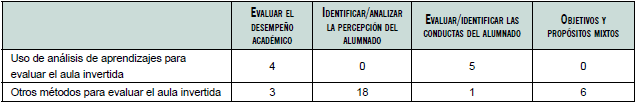 Como apreciamos, los principales objetivos y propósitos de la aplicación del análisis fueron evaluar e identificar conductas de los alumnos respecto al aprendizaje, con cinco artículos. El segundo objetivo y propósito hizo alusión a evaluar el desempeño académico, con solo cuatro artículos. El uso de otros métodos para evaluar el aula invertida volvió a destacar, en particular, al identificar/analizar la percepción del alumnado en relación con la clase de aula invertida, con 18 artículos (esos métodos han sido descritos en detalle en la tabla 2).