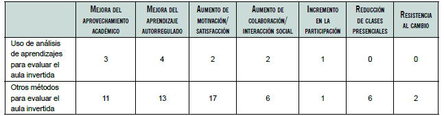 De acuerdo con la bibliografía revisada, los resultados obtenidos tras la aplicación del análisis de aprendizajes en el aula invertida pueden clasificarse de la siguiente manera: mejora del aprovechamiento académico, mejora del aprendizaje autorregulado, aumento de la motivación/satisfacción por parte de los alumnos respecto a la clase de aula invertida, aumento de colaboración/interacción social en el aula invertida, incremento en la participación de los alumnos, reducción del tiempo de clases presenciales o del tiempo en clase con docente, y resistencia al cambio de clase tradicional al aula invertida. Es importante mencionar que algunos artículos presentaron más de uno de los resultados antes descritos, por lo que la suma total de estudios que utilizaron análisis de aprendizaje supera los nueve y los que usaron otros métodos rebasa los 28 (ver tabla 7).