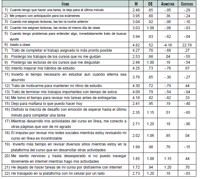 En primer lugar, efectuamos el análisis descriptivo de los 22 ítems a través de la media, desviación estándar, asimetría y curtosis; derivado de ello, eliminamos un ítem, y los 21 restantes resultaron con un alfa de Cronbach de .71. Posteriormente, en el análisis factorial exploratorio, descartamos cuatro ítems: (3) Cuando me asignan lecturas, las leo la noche anterior; (4) Cuando me asignan lecturas, las reviso el mismo día de clase; (5) Cuando tengo problemas para entender algo, inmediatamente trato de buscar ayuda; (22) He trabajado en la plataforma con mi celular por un lado. Los ítems no tenían los puntajes aceptables porque es probable que no sea una conducta habitual de los sujetos.