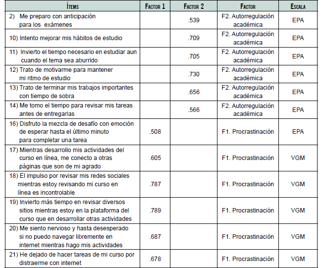La estructura final del cuestionario se ajusta a dos factores: el de procrastinación e internet (factor 1) y el de autorregulación académica (factor 2). Esto puede revelar que el internet representa un medio extraordinario para la formación en línea; sin embargo, también puede convertirse en un poderoso elemento de procrastinación.