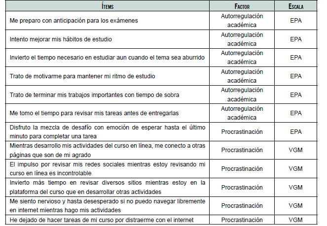 Adaptamos la escala de Busko (1998) e incluimos los ocho ítems de la escala original (ejemplos: Cuando tengo que hacer una tarea, la dejo para el último minuto; Cuando me asignan lecturas, las leo la noche anterior). A este instrumento le agregamos seis ítems, denominados como VGM 1) Mientras desarrollo mis actividades del curso en línea, me conecto a otras páginas que son de mi agrado; 2) El impulso por revisar mis redes sociales mientras estoy revisando mi curso en línea es incontrolable; 3) Invierto más tiempo en revisar diversos sitios mientras estoy en la plataforma del curso que en desarrollar otras actividades; 4) Me siento nervioso y hasta desesperado si no puedo navegar libremente en internet mientras hago mis actividades; 5) He dejado de hacer tareas de mi curso por distraerme con el internet; 6) He trabajado en la plataforma con mi celular por un lado. El formato de respuesta tipo Likert abarcaba cinco opciones, que oscilaron desde nunca (1) hasta siempre (5).